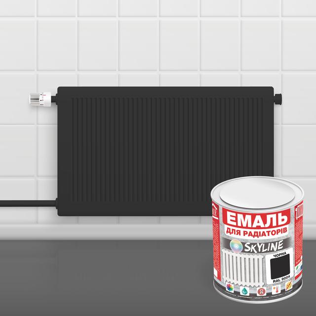 Високоякісна глянсова біла акрилова емаль на водній основі «Емаль для радіаторів SkyLine» (Скайлайн). Термостійка – витримує температуру до +120°С. Не має запаху. Швидко сохне. Не жовтіє. Призначена для декоративно-захисного фарбування радіаторів опалення та труб водопостачання, а також загрунтованого металу. Може бути нанесена на старі алкідні покриття, які міцно тримаються. Використовується усередині приміщень. Створює стійке до механічних навантажень та неабразивних миючих засобів покриття. Атмосферостійка. Містить у своєму складі інгібітор корозії, який дозволяє нанести емаль на ділянки негрунтованої металевої поверхні під час проведення робіт із реставрації поверхні. Міцна, еластична, з високою адгезією та покриваністю.